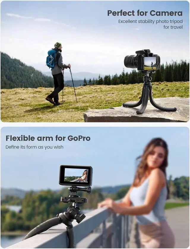 High Durability & StabilityThe 2024 mini phone tripod are made with high-quality silicone, which provides excellent anti-slip, shock-absorbing and abrasion-resistant properties. The legs are made of 8 twisted aluminum wires and the bottom is covered with non-slip silicone. This makes the tripod not only flexible and adjustable, but also ensures a highly stable support when the device is standing on the ground or even on a rocky beach.