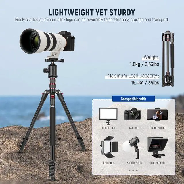 ULTRA STABLE: Tripod legs are made of finely crafted aluminum alloy; Max. load weight is 34lb/ 15.4 kg for optimal performance; The bubble level indicator on ball head help to achieve accurate horizontal alignment and provide photographic stability. Center column is designed with a hook for sandbag to increase stability (Sandbag Not Included); This tripod can make it the best companion of your DSLR cameras and withstand heavier load compared to similar products yet remain stable