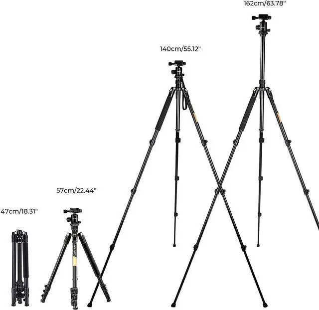 Versatile Heights: Reach new heights with a maximum height of 54.9 '' (1395mm) without the center column, ensuring stability in your shots. Extend it to the maximum 63.8 '' (1620mm) for a broader perspective or minimize to 22.4 '' (570mm) for varied shooting needs.