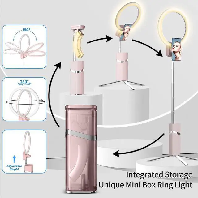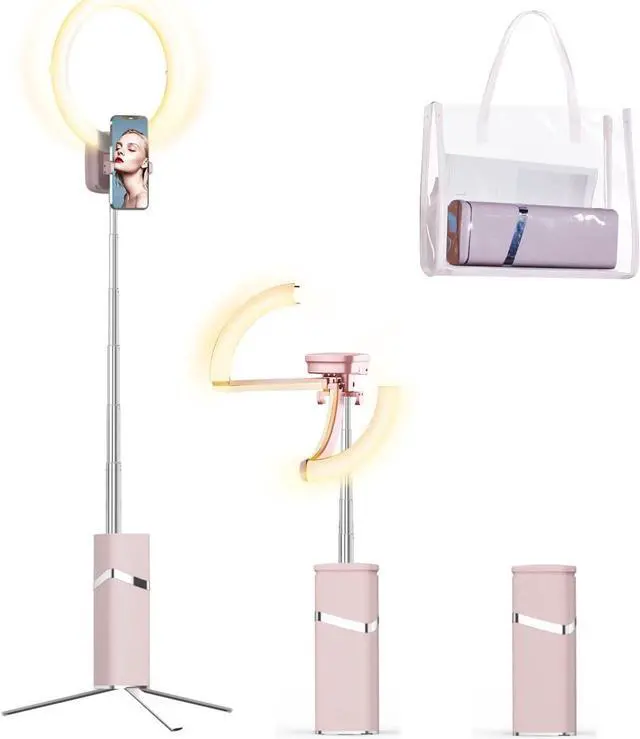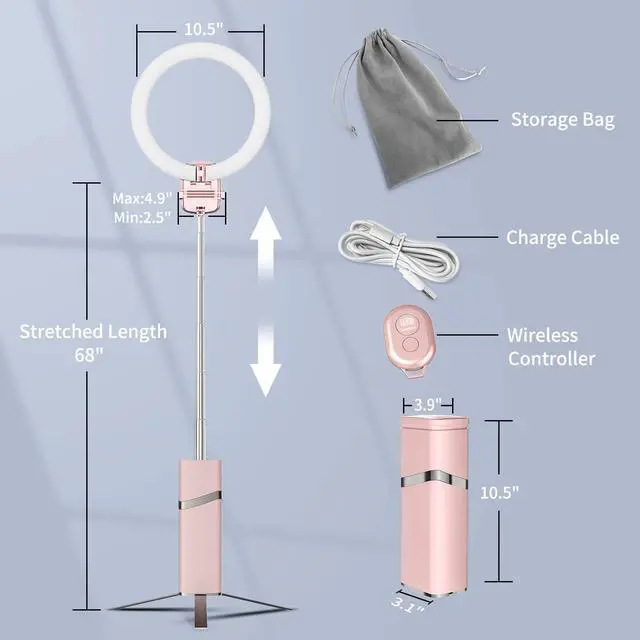 Floor Tripod and Desktop TripodThe ring light with stand combo can be changed from a 10.5" box to a maximum 79" selfie light, suitable for phones that are 3.5" - 6.1". Compared to most ring lights on the market, the whole installation process of this new cordless ring light is fast, only requiring 30 seconds. This means you dont have to deal with a complicated installation process. Just lock the stabilizing tripod to the length you want and simply place it on the desk or floor.