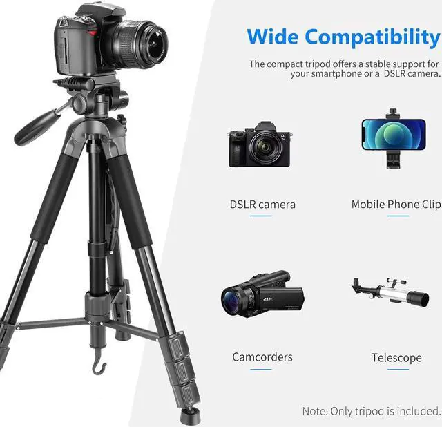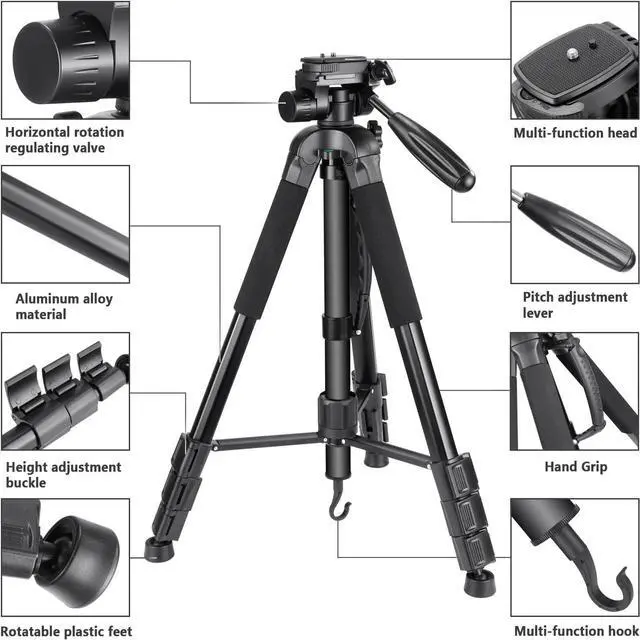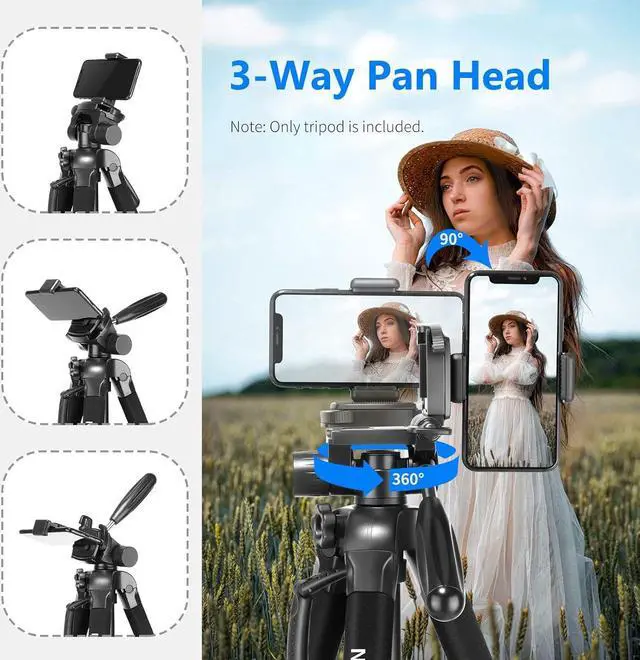 3-Way Swivel Pan Head with Quick Release Plate: 360 degree panning; Allows you to take photos at any angle with horizontally and vertically; Accurate panoramas can be easily orchestrated