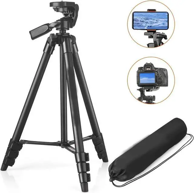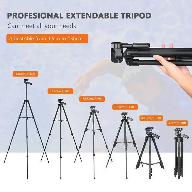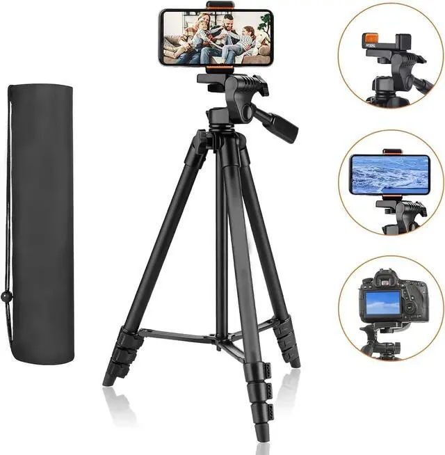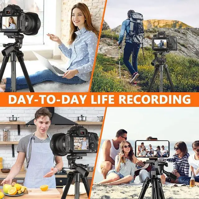 Higher Adjustable Height: 55 inches lightweight tripod is 5 inches longer than other normal tripods; It can collapse to shorter height 16 inches with 3-section and flip-lever leg locks.