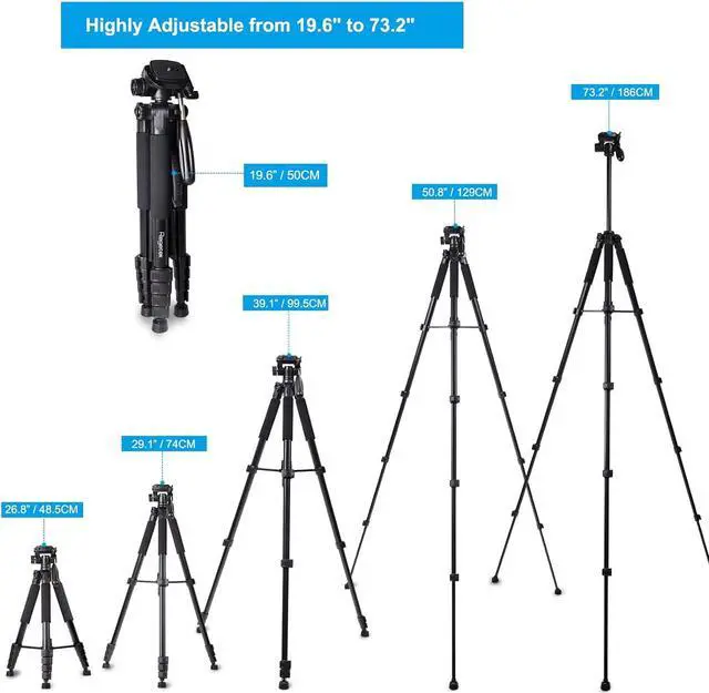 Height AdjustableExtends from 26.8 to 74 inch with 5-section aluminum alloy telescopic leg and extended center column, enables you to create your own unique height and view while taking a picture or video. The 19.6 inches folded size is easy to put into your carry bag especially for traveling.