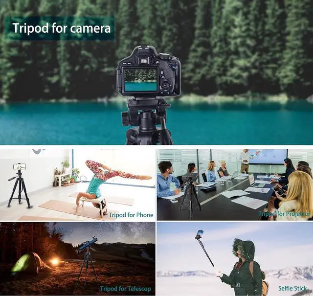 Wide ApplicabilityWith Standard 1/4" Screw, the tripod work with all DSLR Cameras, Camcorder, Projector, Ring Light, Go Pro, Webcam, Spotting Scopes. with a detachable phone mount, the tripods would work with all cell phones whose width is less than 3.97 Inch.