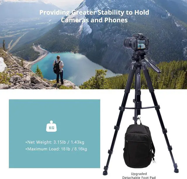 2-in-1 Aluminum Tripod & MonopodThe tripod can convert toMonopod. 3.15 lbs Net weight; 18 lbs Load Capacity. Foldable Feature for Travel.