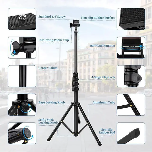 Professional Tripod & Selfie Stick This phone tripod stand can convert into an extendable selfie stick and desktop tripod effortlessly. It is made of high-grade aluminum alloy, lightweight yet corrosion-resistant, sturdy and durable, enough to hold it securely in place without tipping over. Wider legs and non-slip rubber feet make the tripod more stable and less likely to tilt and fall over. 17-70 inches adjustable height of the cell phone tripod satisfies your needs on different occasions.