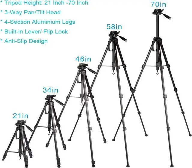 Aluminum Tripod & Monopod: Adjustable Center Column Converts to 4-Section 21"-72" Tripod and 5-Section 18"-65" Monopod. 3.63 lbs Net weight; 8.8 lbs Load Capacity. Foldable Feature for Travel.