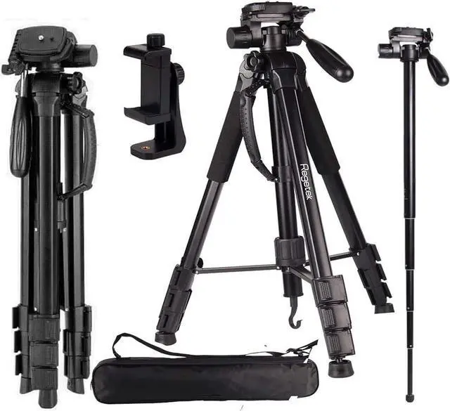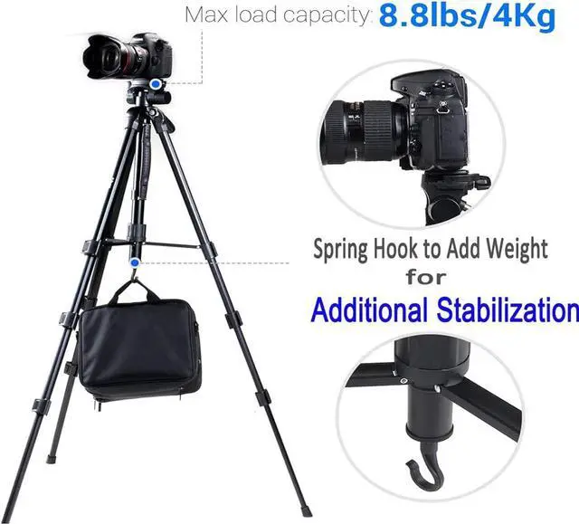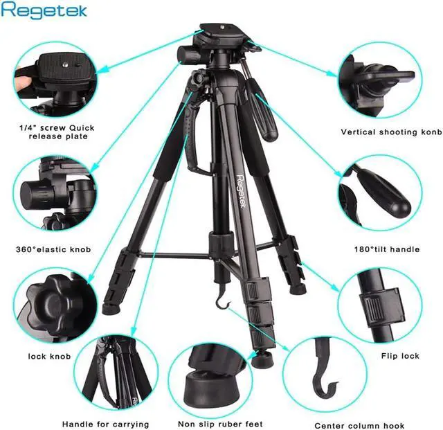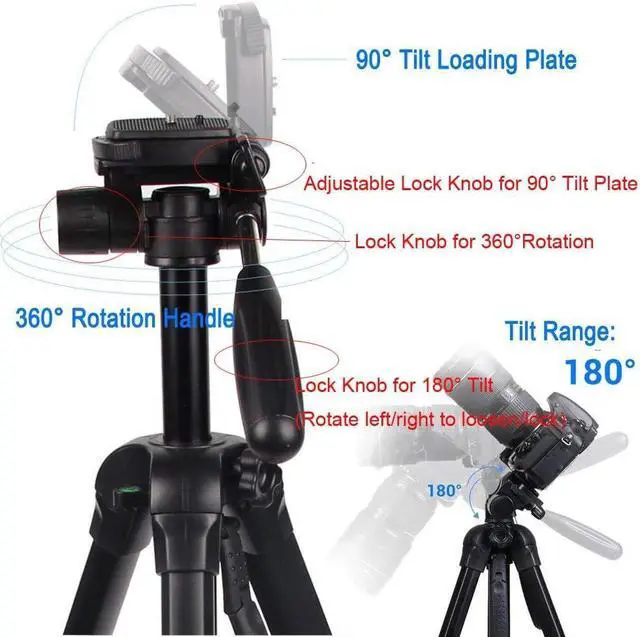 360°Telescopic Pan Handle; Large Handle for Carrying Conveniently; Flip-Locks for Leg Height Adjustment; knobs & Non-slip Pongee/Rubber Mats for Strong Stability; Center column hook for Hanging Additional Accessories/Adding Weight to the Tripod for Additional Stabilization. A Carrying Bag & Gift Box is Included.