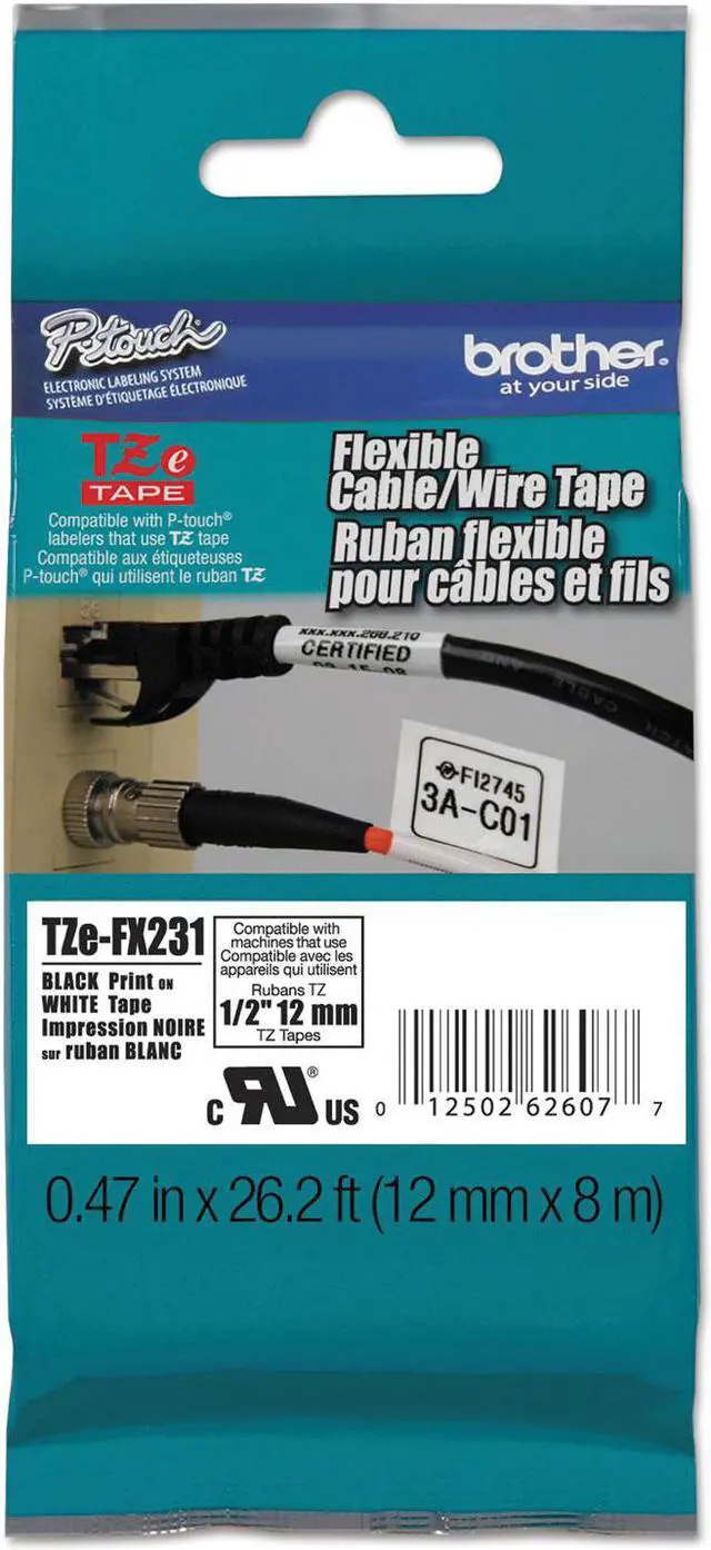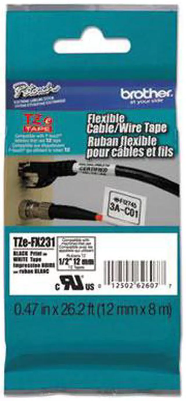 Special adhesive for bending, wrapping and flagging. Use on cables, wire, pipes and other cylindrical surfaces plus vials, beakers, test tubes, electrical fittings and connectors. Not suitable as an electrical insulator. For Use With All TZe Series Label Makers. Label Size - text: 0.47" x 26.2 ft; Label Color(s): White; Machine Compatibility: Brother P-Touch PT-1000, PT-1000BM, PT-1010, PT-1010B, PT-1010NB, PT-1010R, PT-1010S, PT-1090, PT-1090BK, PT-1100, PT1100SB, PT-1100SBVP, PT-1100ST, PT-1120, PT-1130, PT-1160, PT-1170, PT-1180, PT-1190, PT-11Q, PT-1200, PT-1230PC, PT-1280, PT-1280SR, PT-1280VP, PT-128AF, PT-1290, PT-1290BT, PT-1290BT2, PT-1290RS, PT-1300, PT-1400, PT-1500, PT-1500PC, PT-1600, PT-1700, PT-1750, PT-1800, PT-1810, PT-1830, PT-1830C, PT-1830SC, PT-1830VP, PT-1880, PT-1880C, PT-1880SC, PT-1880W, PT-1890C, PT-1890SC, PT-1890W, PT-18R, PT-18RKT, PT-1900, PT-1910, PT-1950, PT-1960, PT-200, PT-2030, PT-2030AD, PT-2030VP, PT-2100, PT-2110, PT-2200, PT-2210, PT-2300, PT-2310, PT-2400, PT-2410, PT-2430PC, PT-2500PC, PT-2600, PT-2610, PT-2700, PT-2710, PT-2730, PT-2730VP, PT-300, PT-300B, PT-310, PT-310B, PT-320, PT-330, PT-340, PT-350, PT-3600, PT-4000, PT-520, PT-530, PT-540, PT-550, PT-580C, PT-6100, PT-7100, PT-7500, PT-9200DX, PT-9200PC, PT-9400, PT-9500PC, PT-9600, PT-9700PC, PT-9800PCN, PT-D200, PT-D200BT, PT-D200DA, PT-D200MA, PT-D200SA, PT-D210, PT-D400, PT-D400AD, PT-D400VP, PT-D450, PT-D600, PT-D600VP, PT-E100, PT-E300, PT-E500, PT-E550W, PT-H100, PT-H300, PT-H300LI, PT-H500LI, PT-P700, PT-P750W, PT-P750WVP, PT-P900W, PT-P950NW, ST-1150, ST-1150DX, ST-5; Text/Label Colors: Black Print on White Tape.