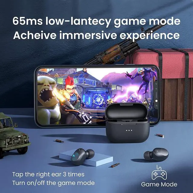 65ms Low Latency Game Mode: Wireless Earbuds have 3D surround sound and realize a game-level ultra-low latency connection close to 65ms. You only need to tap the right earbud three times in a row to enter the game mode.