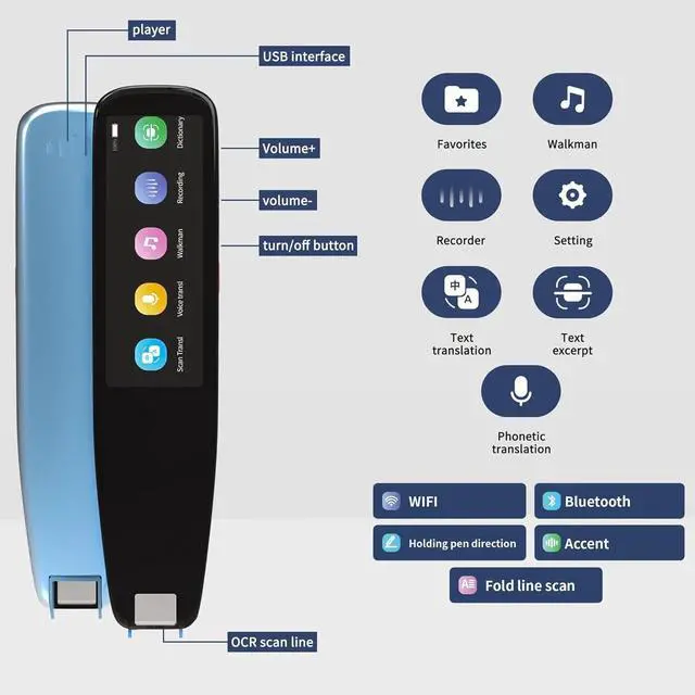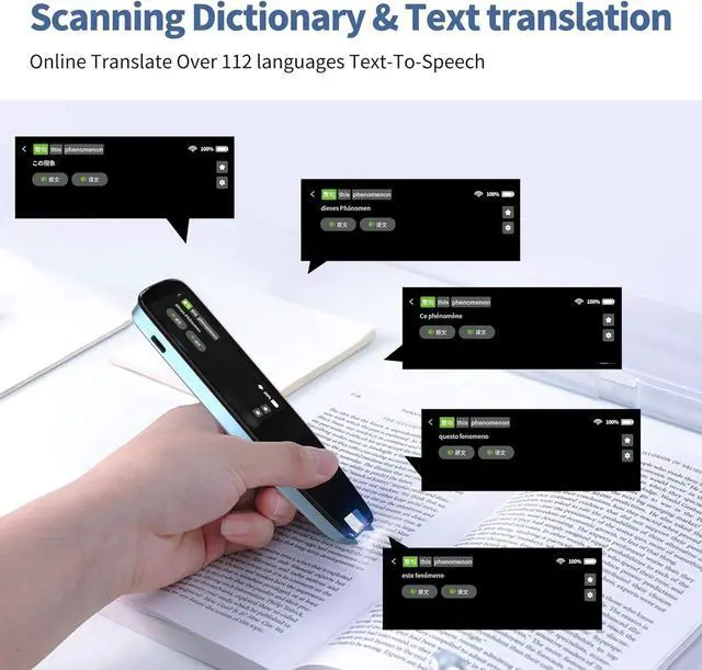 Text-to-Sp Function: Choose a target language, slide the pen over printed text, and instantly receive and hear translations with a human-like digital voice