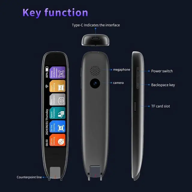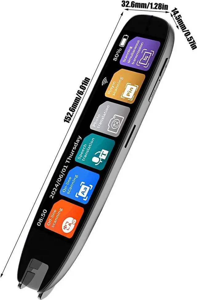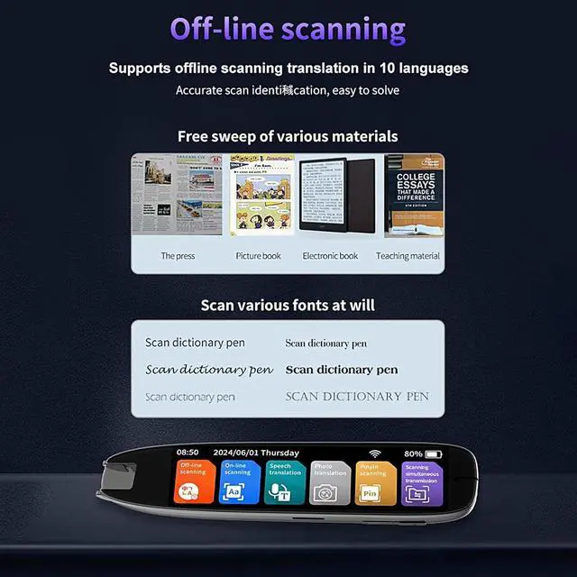 On-lines scanning: rts fast scanning and translation of 142 languages, real-time update of vocabulary, high recognition rate, reverse search of Chinese and English words, evaluation of English words and sentences,