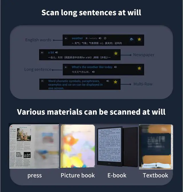 [ALL-IN-ONE SCANNING FUNCTION] Experience seamless text recognition with our multifunctional scanning pen that effortlessly reads picture books, textbooks, newspapers, and magazines. It provides quick access to entries, detailed illustrations, and comprehensive explanations, serving as your personal digital library for enhanced learning and information access.
