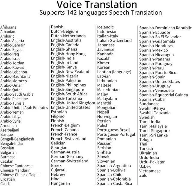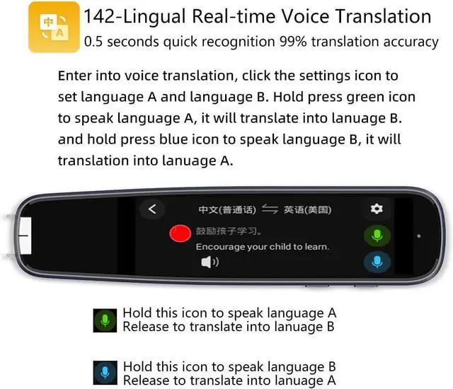 Voice translationThis function allows you to perform real-time language translation, set up language A and language B Press and hold the voice button (green) to speak language A, you can translate language B Press and hold the voice button (blue) to speak language B, you can translate language A Please note that the device is connected to the network before using this function.