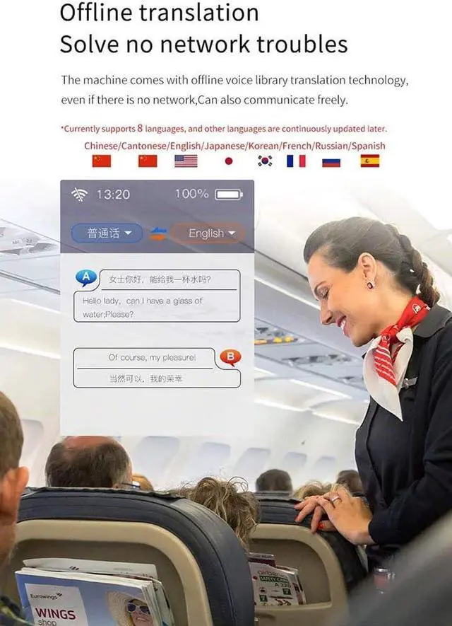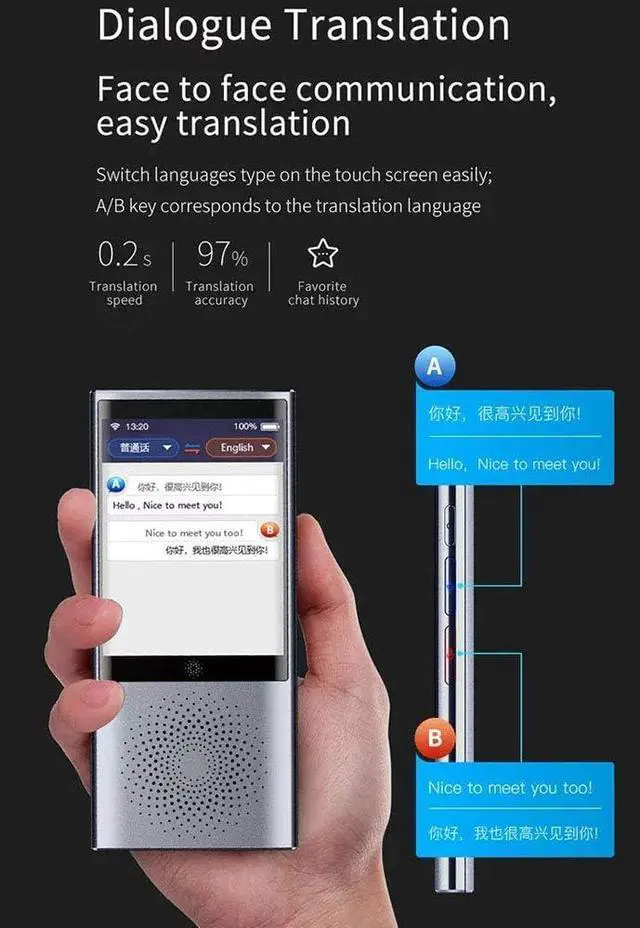 Double translation :Dialogue TranslationFace to face communication, easy translation Switch languages type on the touch screen easil;A/B key corresponds to the translation language