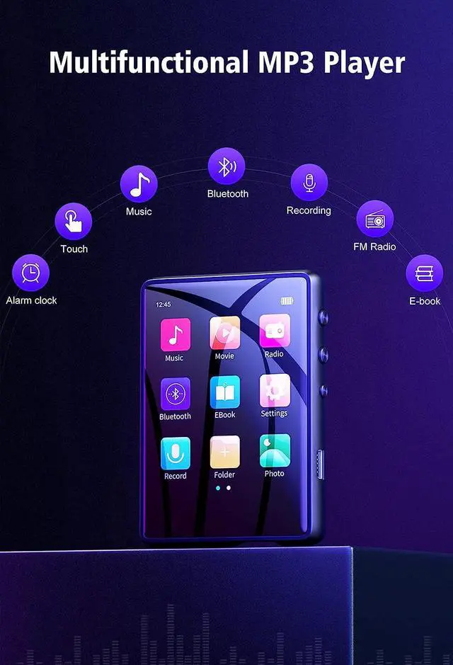 Versatile Music Player 2.4" full touch capacitive screen, smooth and responsive. Various functions including music, FM radio, recording, video, picture, stopwatch, alarm, calendar, built-in speaker.
