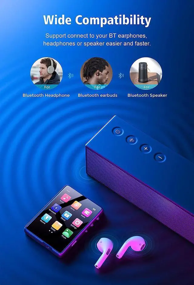 Updated Bluetooth 5.0 ChipWith built-in Bluetooth 5.0, advanced AAC audio decoding, this MP3 player not only provides further and faster connection, but also enhanced the stability. Lower comsumption and longer battery life. (Attention: This MP3 player only works as a transmitter, pls connect it with Bluetooth earphone or speaker, but not the mobile phone or computer)