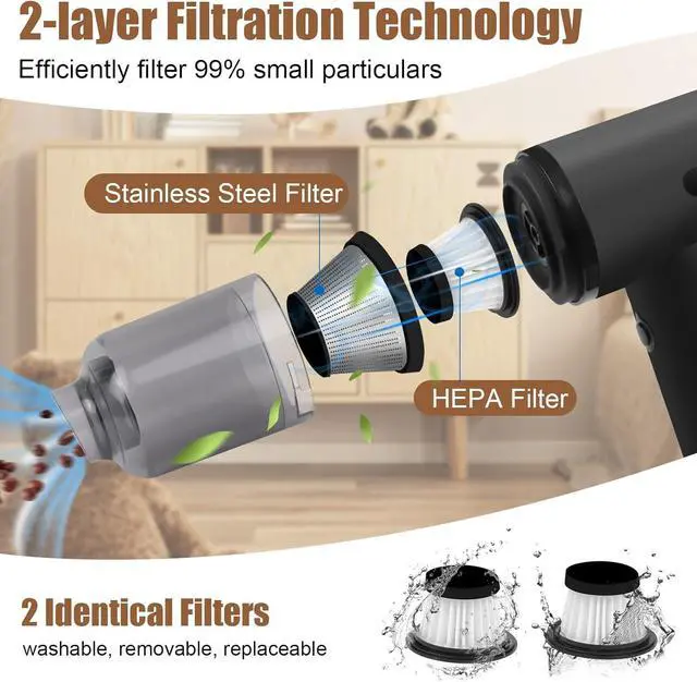 Washable Dual Filtration The cordless handheld vacuum features a washable and reusable stainless steel filter + HEPA filter, which filters out debris more efficiently and protects the high-speed motor for a longer lifespan. In addition, it is equipped with 2 replaceable HEPA filters, so you can use it alternately. (Note: Filters must be kept dry when in use or suction power will be reduced).