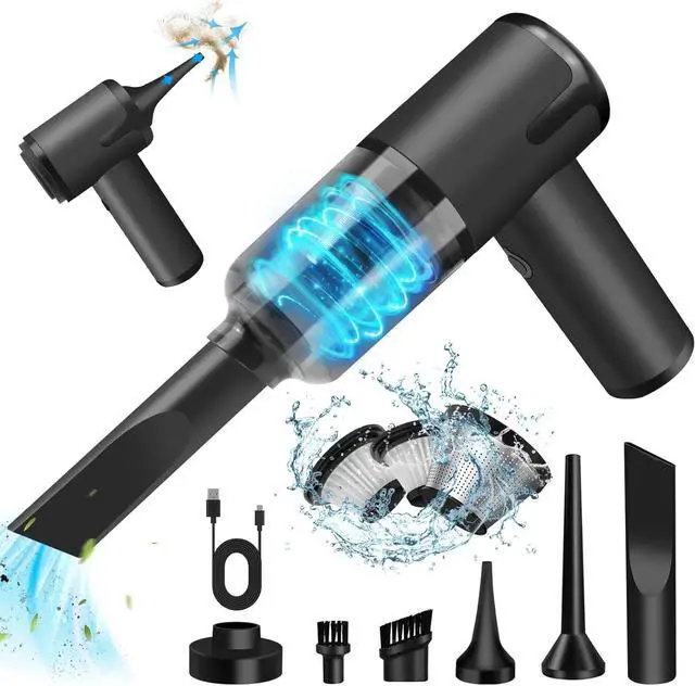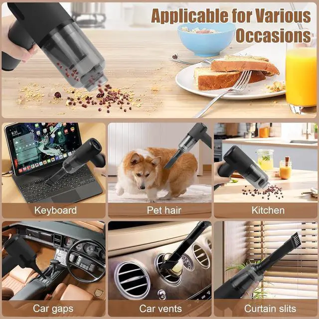 Suction, Blow, and Extraction 3-in-1Mini handheld vacuum adopts advanced 3-in-1 technology of suction, blowing and charging to meet your daily needs in all aspects. Equipped with different nozzles for blowing, vacuuming and extracting. You can mount the nozzle on the back of the cordless vacuum to make it a hair dryer.