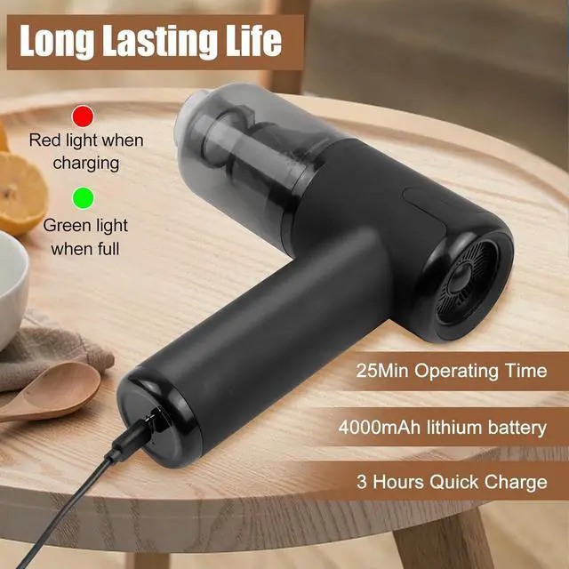 Long Battery Life & Type-C RechargeableThe rechargeable vacuum has 2 built-in 2000mAh batteries, and with the Type-C charging cable, a full charge only takes 3- 3.5 hours, providing 20-25 minutes of use.