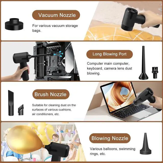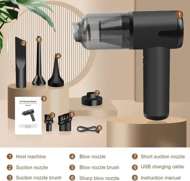 Multi-Functional AccessoriesPortable vacuum cleaner includes 1 handheld hoover, 1 suction nozzle, 1 suction nozzle brush, 1 blow nozzle, 1 blow nozzle brush, 1 sharp blow nozzle, and 1 vacuuming nozzle. The combination of attachments meets the daily cleaning needs of your vehicle and home, ensuring you can clean all areas.