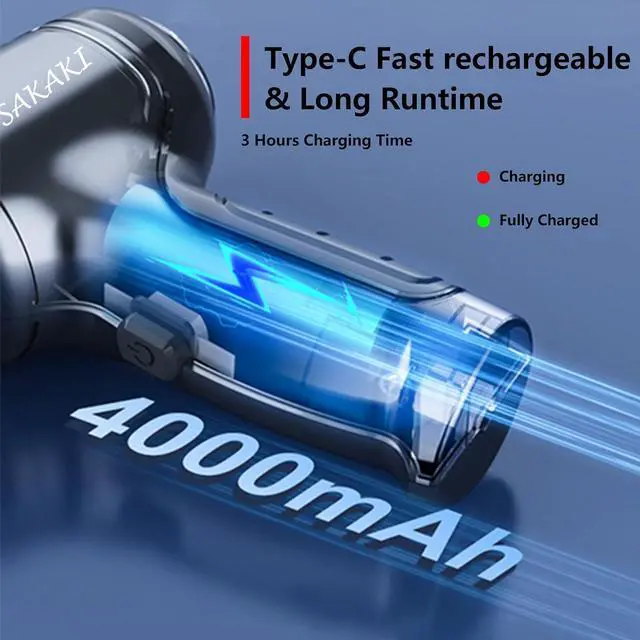 Type-C Quick ChargingThe rechargeable mini handheld vacuum cleaner built-in 4000mAh large capacity battery, which can be fully charged in 3-4 hours and last for about 20 minutes. (Note: Please fully charge the vacuum before first use with adapter 5V 2A, The length of time is about 10 minutes in the case of high-speed grade use, and about 20 minutes in the case of low-speed grade with a full charge. )