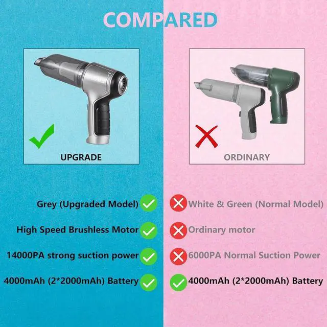 Multifunctional Vacuum CleanerPortable vacuum cleaner has full practical accessories that include suction nozzle and brush, floor brush, blow brush and nozzle. The nozzle is perfect for narrow spaces, while the brush nozzle is great for cleaning car air outlets and pet hair on carpets. The large caliber nozzle can clean larger particles, such as food crumbs. Plus, it comes with a storage box to keep all your accessories together.