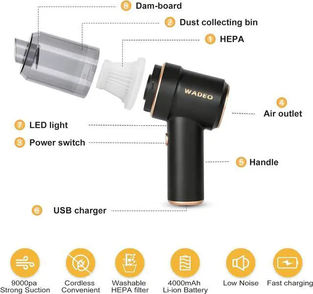 Cordless Lightweight Hand Vacuum Cleaner: This mini vacuum is very convenient to carry, weighs only 0.73 lb (333g) and has a suction power of up to 9000PA; the cordless vacuum cleaner design allows you to move freely while cleaning corners of your home, car or office. Equipped with LED light for easy cleaning of dust in dark corners.