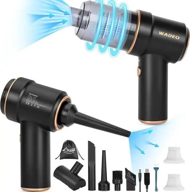 Powerful Air Duster & Mini Vacuum: This wireless handheld vacuum cleaner has built-in 4000mAh lithium battery (2 x 2000mAh battery), adopts 5V/2A adapter can quickly fully charge in 2.5 -3 hours that can provides up to 30-40 minutes of battery life for vacuuming.