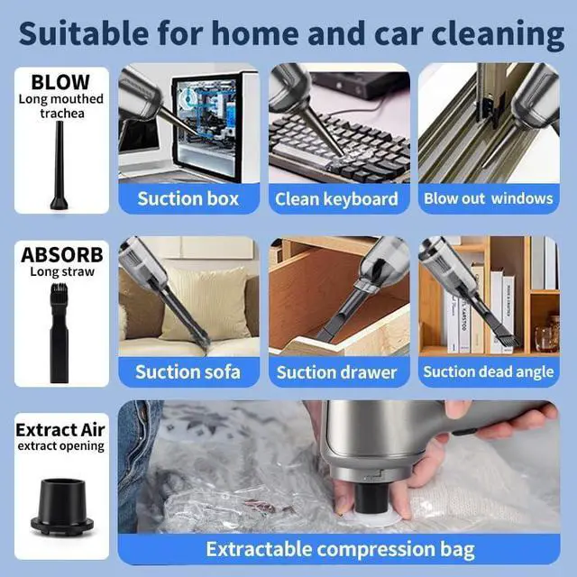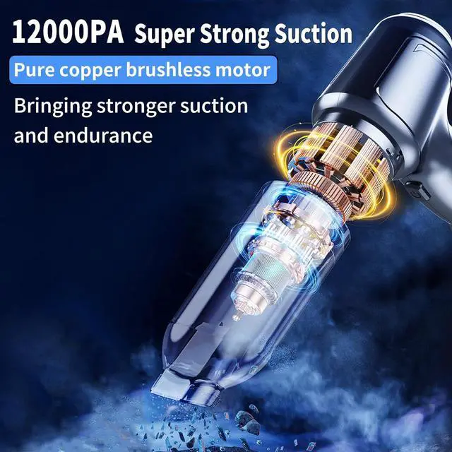 Powerful Suction & VersatileWith a suction power of 12000PA, this car-mounted handheld cordless vacuum easily picks up dust, debris, and pet hair. The multi-functional suction head reaches inaccessible areas like under the seat, making cleaning a breeze.