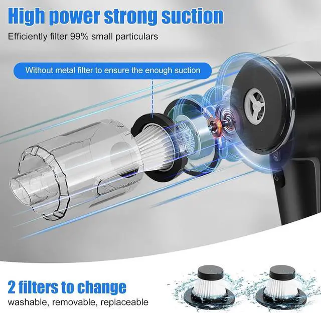 Washable and reusable filtersThe car vacuum cleaner is equipped with a transparent large-capacity 0.2L dust collection cup, rotates to disassemble, and quickly dumps out the garbage. The filter is washable and can be reused after drying.
