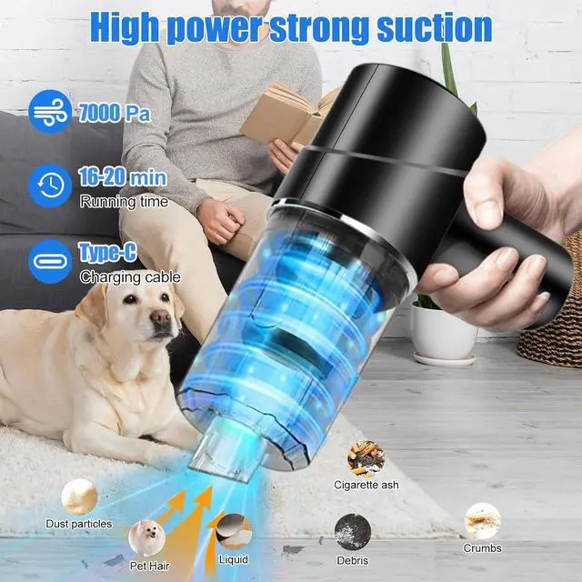 7000Pa high power suctionEquipped with a digital high-speed motor, the handheld vacuum has 7000Pa strong suction power, and is easy to clean dust, and food residue. Once charged only takes less than 2 hours, and can run for 16-20 minutes (Running time may vary depending on cleaning load).