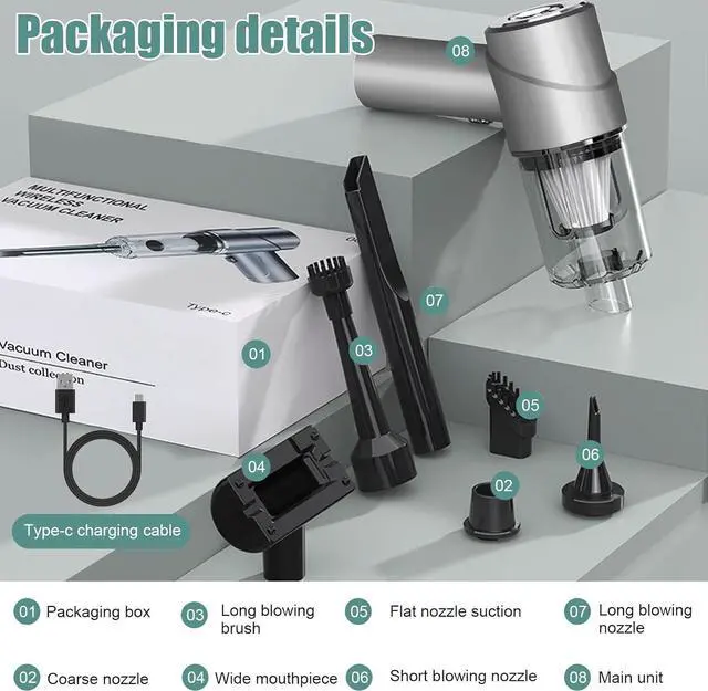 You will getThis handheld vacuuming cordless totally include 1xhandheld vacuum, 2xfilters, 1xlong tube suction nozzle, 1xbrush nozzle, 1xlarge brush, 1xlong tube mouthpiece, 1xblowing mouth brush, 1xlong exhaust pipe, 1xshort exhaust pipe, 1xtype-c charging cable and 1x user manual.