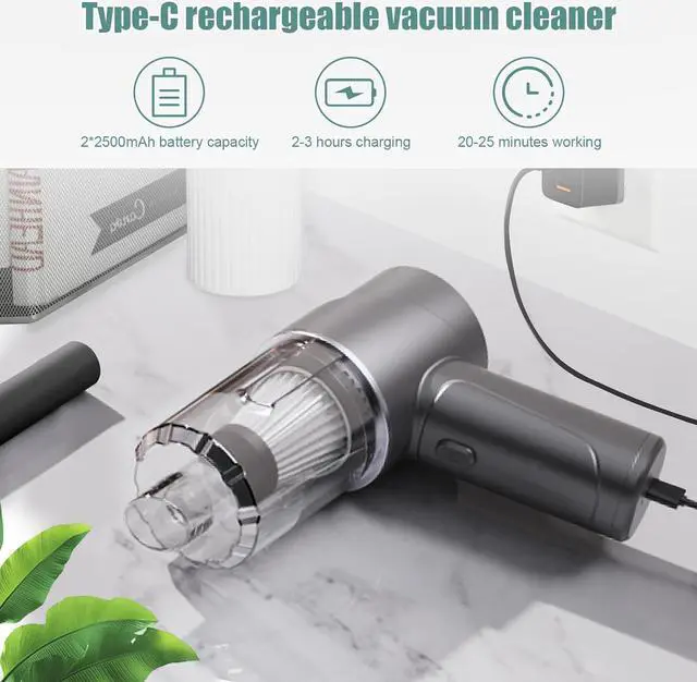 Fast charging and long working timeThis handheld cordless vacuum cleaner is equipped with a 5000mAh battery. With the Type-C charging cable, and it takes about 2-3 hours for fully recharging, working continuously for 20-25 minutes. (Note: please fully charge the handheld vacuum when you use it for the first time. )