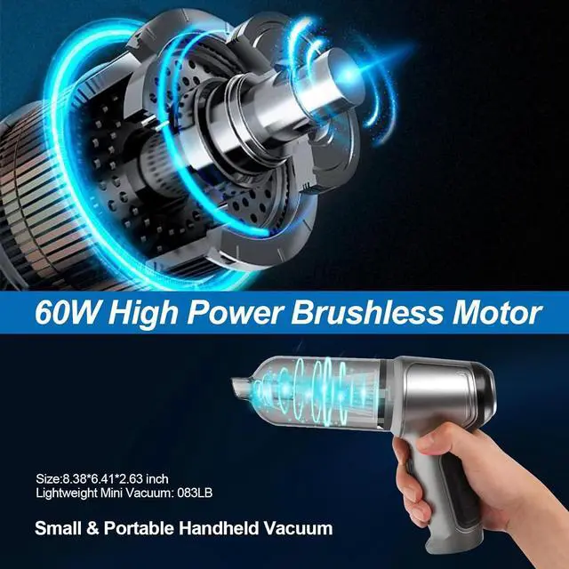 Compact And Portable VacuumOur mini vacuum cleaner is ergonomic handle design, it weighs only 0.82 lb (372g). It can be cleaned quickly and easily anytime and it will not feel tired even if it is held for a long time. In addition, We put the motor and battery behind the handle to keep the gravity balance, the lightweight and portable design helps you to take freely while cleaning corners of your home, auto or office. It's really give you a better use experience that you can easily carry and store it!