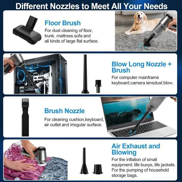 Multi-In-1 hand held vacuum cordlessSUNCANDXY handheld car vacuum cleaner has 3-in-1 multifunctional use, it meets most of the cleaning needs of your life. Not only it can be used as a small vacuum cleaner for daily cleaning of your vehicle, home and pet hair, but you can also meet the vacuuming, blowing and pumping a variety of scenarios for use. It equipped with 5 different shapes of nozzles to meet all usage requirements, which can not only clean the gaps that are difficult to clean such as air conditioners, computer hosts and cars interiors, but also clean large stains such as sofas and drawers.