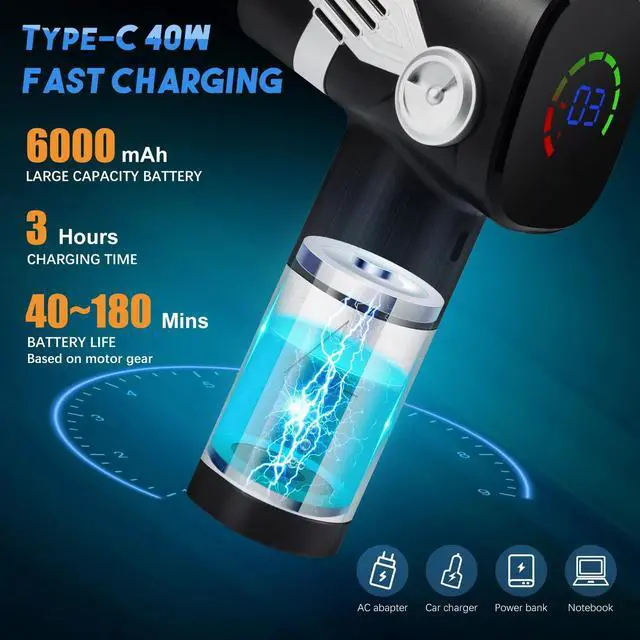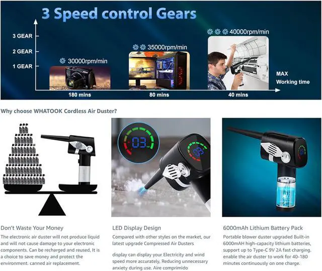 Upgrade LED display showing the remaining power and gear modes accurately.The air duster has 3 speeds,6000 mAh battery can continue to run for 30-60 minutes