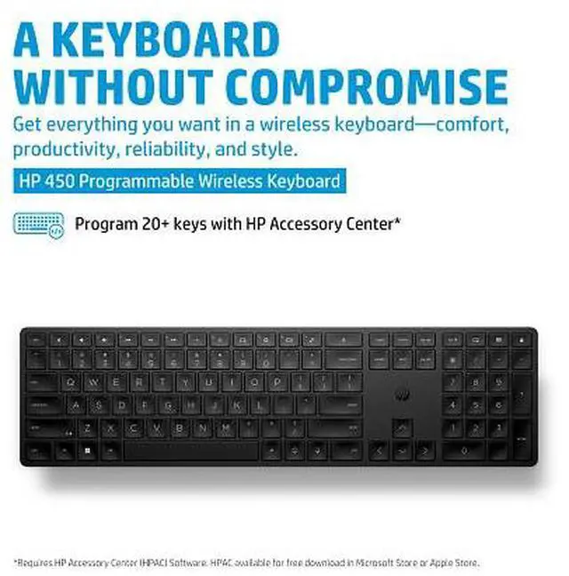 OverviewNow you can get everything you want in a wireless keyboard comfort, productivity, reliability and style. Customize the functions of 20+ keys to work faster and smarter. Made with sustainably-sourced materials, it's also easy to keep clean and sanitary. What's in the box? Wireless keyboard; USB dongle; 2 x AAA batteries; Quick start guide; Warranty card; R. E. D. Card (EMEA only) Disclaimers Requires HP Accessory Center (HPAC) Software. HPAC available for free download in Microsoft Store or Apple Store. Recycled plastic content percentage is based on the definition set in the IEEE 1680.1 -2018 EPEAT standard.