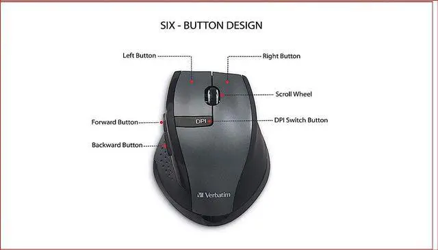 Mouse functionality includes: Right and left click, Back and forward for websites, Scroll wheel, Zoom, Adjustable DPI