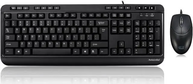 The Adesso Multimedia Desktop Keyboard &Mouse (AKB-132CB) is an antimicrobial keyboard & mouse combo built to make handling your daily computer tasks easier. This keyboard features 14 hotkeys for quick access to your media player controls, email, internet browser and other common applications such as My Computer, Mail and Calculator. The keyboard uses quiet membrane key switches that provide a more quiet, tactile response. Available with either a USB or PS/2 connector.