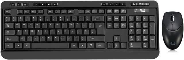 The Adesso 2.4 GHz Wireless Desktop Keyboard & Mouse Combo offer users two supreme input devices with a wireless range up to 30 feet. The wireless keyboard features 14 hotkeys for quick access to your media player controls, email, Internet browser and other common applications like My Computer, Mail and Calculator. The keyboard uses quiet membrane key switches that provide a more quiet and tactile response. The wireless mouse is equipped with an optical sensor that is more sensitive and accurate than a traditional optical mouse. This combo is ideal for use in your office or home.