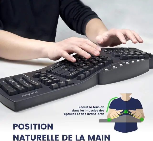 Le repose-poignets intégré avec design courbé offre un support supplémentaire pour les mains, reliant continuellement lutilisateur au clavier sans effort musculaire.