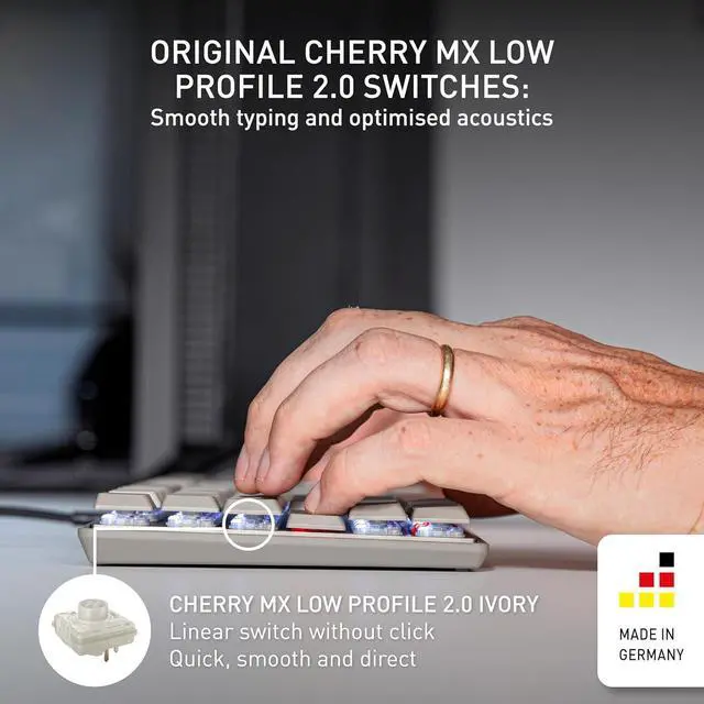 CHERRY MX LOW PROFILE 2.0 IVORY switches: smooth and instant typing feeling with linear switching properties (no click) and over 100 million activations per key