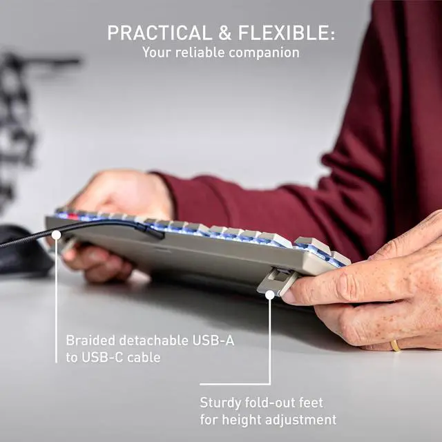 Practical features: Full N-key rollover (all keys are taught by default), anti-ghosting (no typos), rigid fold-out feet & attachable USB-A to USB-C cable
