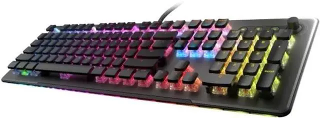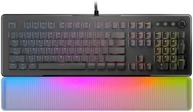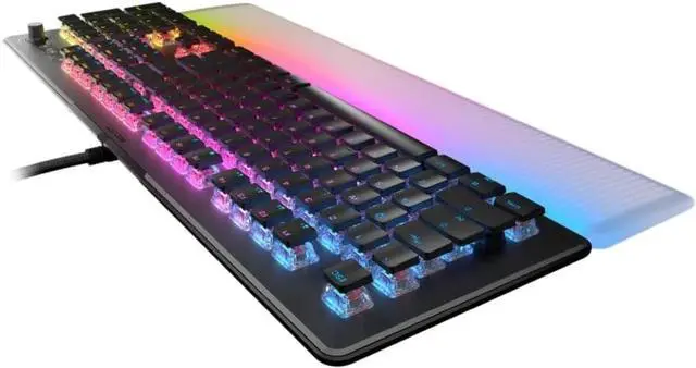 The Vulcan II Max Optical-Mechanical Gaming Keyboard combines durability, performance, and functionality into a dazzling RGB filled design. The exclusive TITAN II Optical switches have a smooth, hyper-fast actuation and incredible durability with a 100 million click life cycle. Feel confident in your keystrokes with 24 multi-function smart keys featuring a unique dedicated LED to indicate when secondary functions are active. Enter game mode to access Easy-Shift [+] button duplicator technology and unlock a second programmable function layer. The detachable, translucent silicone palm rest sets the stage for ROCCATs AIMO RGB lighting displays right out of the box and can sync with other compatible AIMO products.