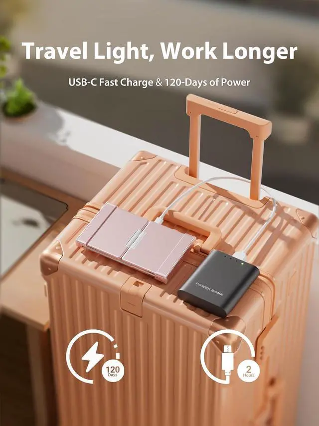 A 2-h USB-C charge powers 60 days at 2 h/day (touchpad on). Fold the board to sleep; Red LED = <10 %you can keep typing while charging.