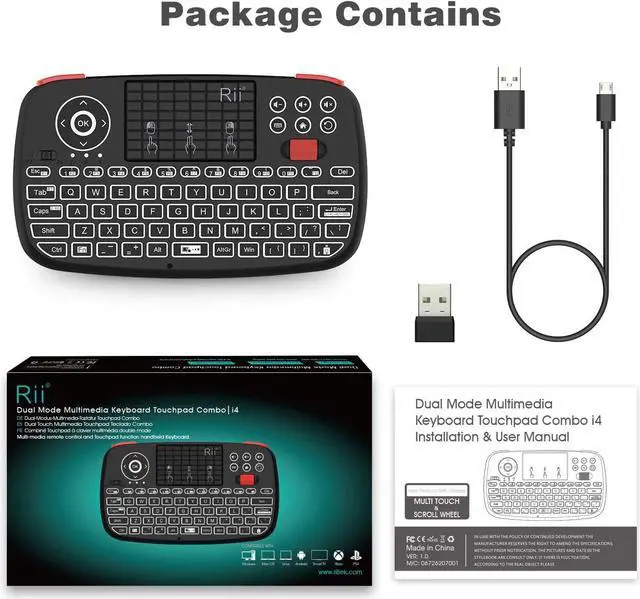 Package Contents: Rii MINI Wireless Bluetooth keyboard USB charging cable and 2.4G USB dongle.