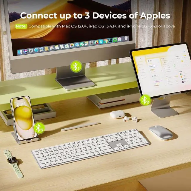 Multi-Device Connectivity for Mac Users: The Bluetooth Keyboard Mouse Set is expertly crafted for Apple enthusiasts. Boasting a standard Apple layout and innovative BT1/BT2/BT3 technology, effortlessly switch between your iMac, MacBook Pro/Air, and iPad