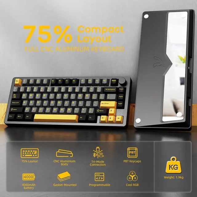 Gasket Structure & Ultimate Feel and SoundThis aluminum mechanical keyboard is designed with Gasket structure, with axis positioning plate and PCB single key slot, providing soft and elastic hand feeling, every strike is full of comfort. 5 layers of fully padded design, effectively eliminating the cavity sound, bringing pure HIFI-level key sound, so typing and gaming become a Make typing and gaming an enjoyable experience. Custom keyboard equipped with three spelling color original height PBT keycaps, wear-resistant and oil-resistant, not easy to slip for a long time, and at the same time add fashionable aesthetics to the desktop.
