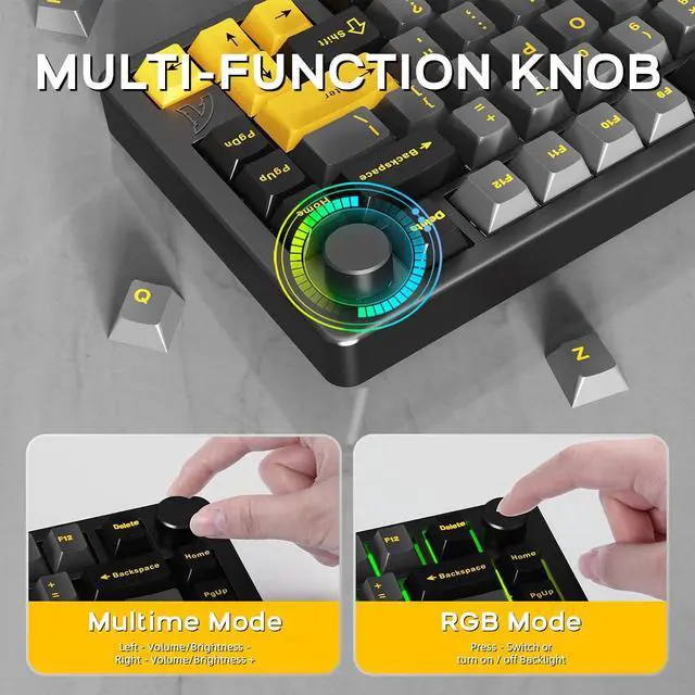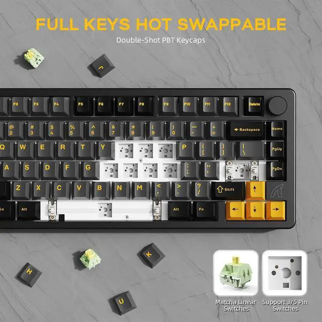 Personalized Customization&Superior Tactile ExperienceThis hot swappable mechanical keyboard is compatible with 3-pin or 5- pin switch, making it easy for users to change axes freely to meet personalization needs. Equipped with customized linear matcha switches, light and smooth touch, crisp and pleasant sound, providing the ultimate hand experience. Mechanical keyboard comes with precision-tuned stabilizers, no need to worry about key wobble, providing a stable and quiet typing experience. Whether you're looking for personalization or superior feel, this keyboard is perfect for your needs.